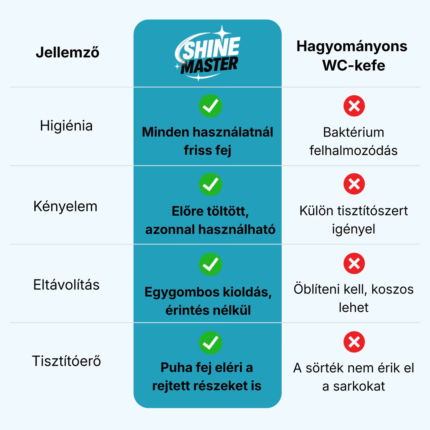 Minden használatnál friss, tiszta fej. Nincs több koszos, ázó kefe a sarokban.